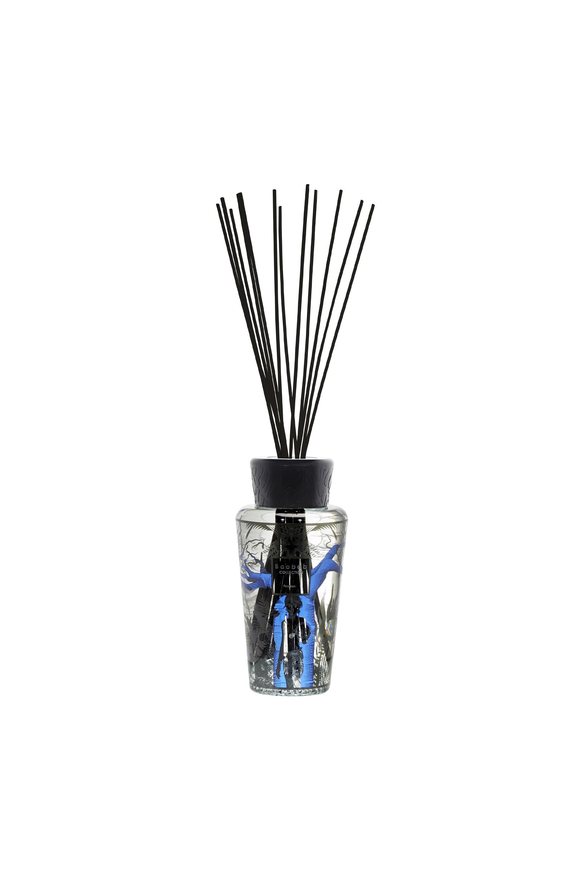 Зі склом, прикрашеним оригінальною фрескою художника Янна Леджендра, пляшка домашнього ароматного дифузора Feathers Touareg - це сучасний об'єкт, оброблений чорною бакелітовим ковпачком з вигравіруваним кореневим малюнком.
