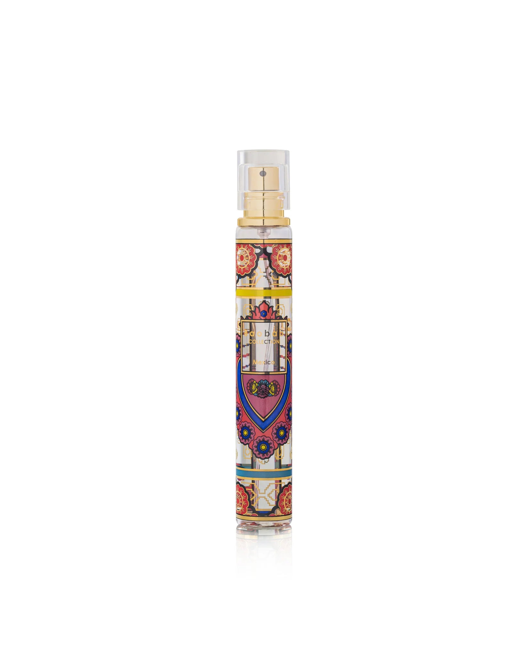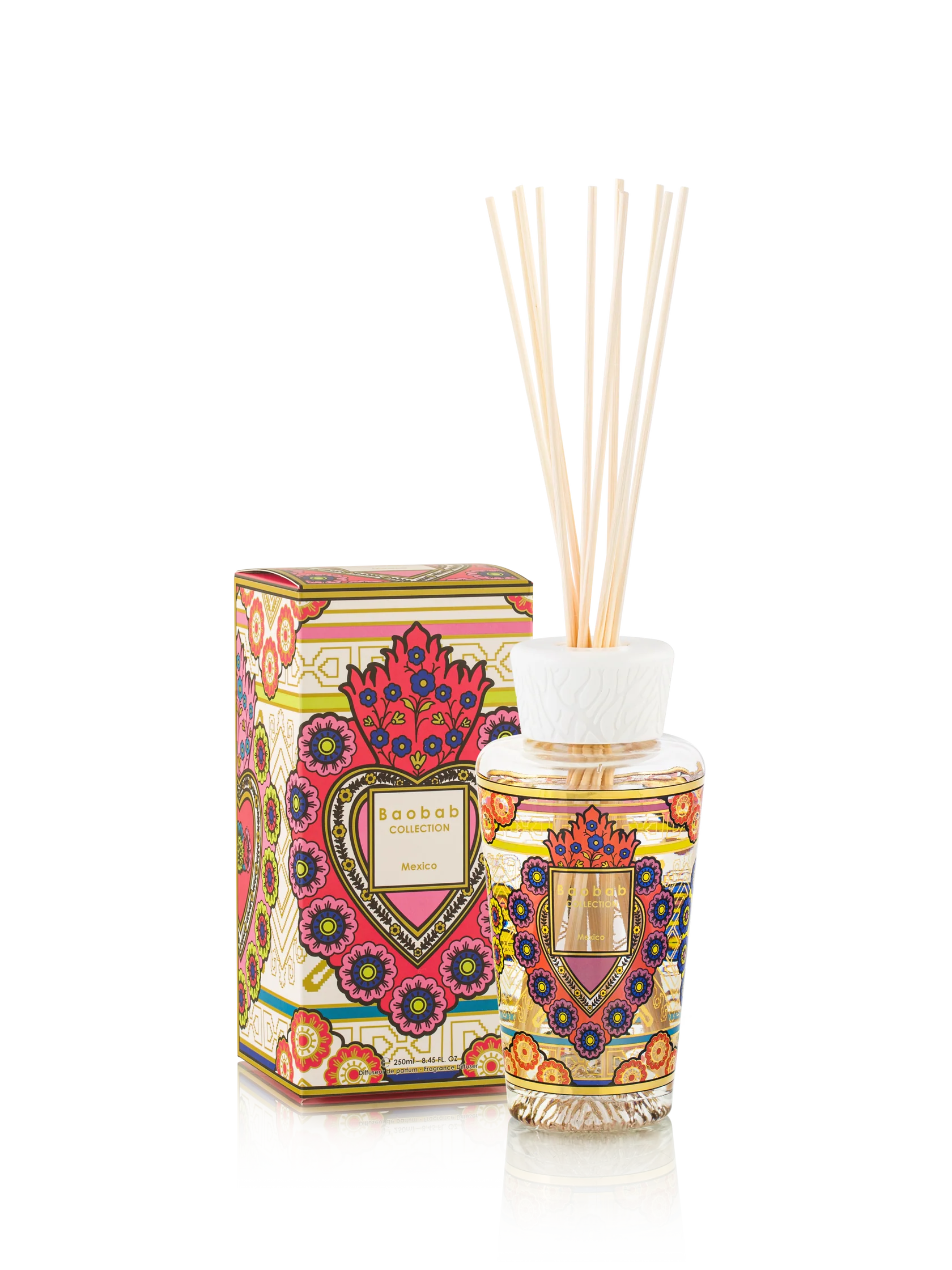 Аромадифузор Mexico – це витончений поєднання мистецтва та аромату. Скло, прикрашене кольоровим і золотим шовкотрафаретним візерунком, зображає серце ex-voto – символ духовності, вдячності та здійснених бажань. Сердечні мотиви, розкидані по всій поверхні, доповнені ніжним орнаментом на дні, що нагадує традиційні мексиканські ремесла та корсажі Фріди Кало.