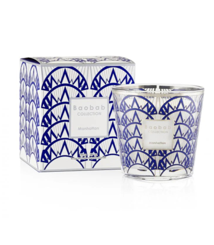 Ароматична свічка Manhattan відлита у скляний флакон із платиновим та темно-синім шовкографічним візерунком, натхненним ар-деко архітектурою будівлі Крайслер.